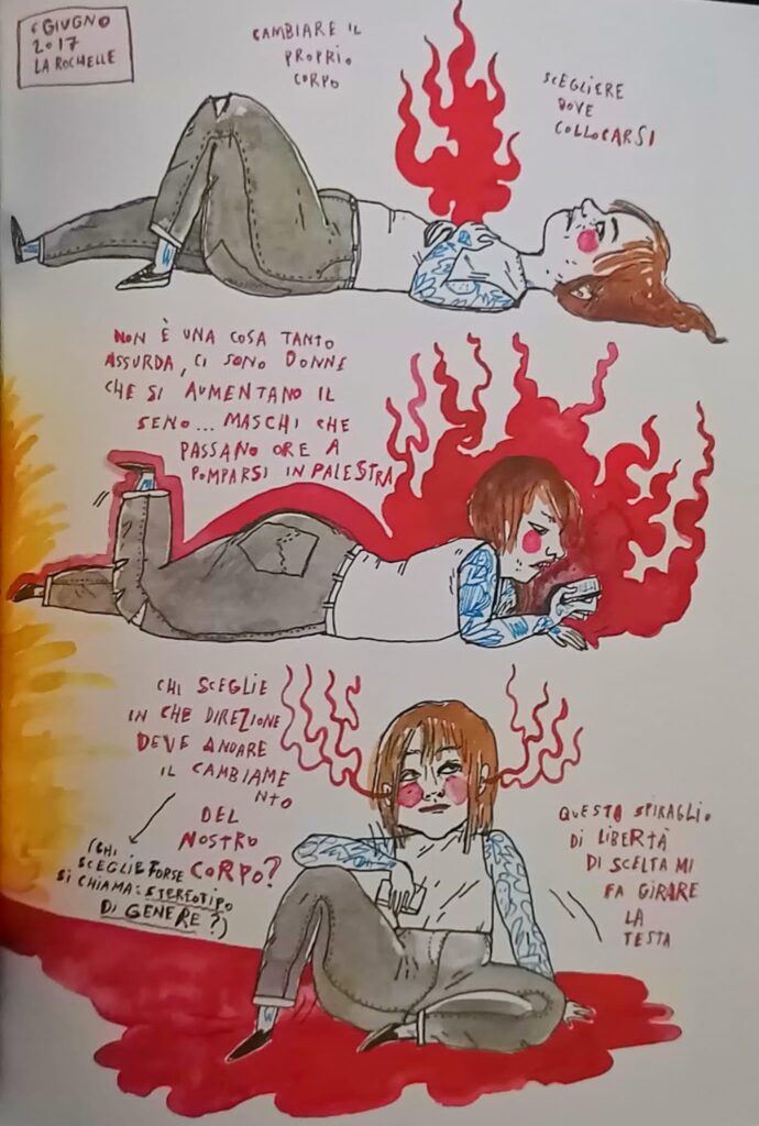 Sbirciamo ora nel taccuino segreto di un’illustratore e tatuatore romano, espatriato in Francia. Questo è suo il secondo graphic novel, che si colloca in continuità ma anche in antitesi al precedente Born to lose (coconicopress, 2017). Play with fire di Nicoz Balboa (Oblomov, 2020) si apre con due epigrafi. Un verso dei Rolling Stones, da cui il libro prende il titolo, e una citazione del filosofo della Transizione Paul B. Preciado: “[…] è attraverso la fragilità che opera la rivoluzione”. Di certo vediamo molta fragilità e onestà in queste pagine. Paure e insicurezze, lontano dall’essere dipinte con toni cupi, si specchiano in se stesse, e il risultato è un’esplosione di colori, sketch e acquerelli. L’autore si racconta nel passare degli anni, attraverso disavventure tragicomiche, paranoie, relazioni più meno deludenti. E poi le domande inquiete, l’autocoscienza, i dolci dialoghi con la figlia. Denso e pieno di stimoli, Play with fire è una sorpresa a ogni pagina, un perfetto esempio del potere terapeutico dell’arte e della scrittura di sé. Il gender è qui interrogato in un’ottica di desiderio, piacere e benessere, dei quali si rivendica apertamente il diritto. Un inseguimento di sensazioni euforiche, alla ricerca di sé: gender euphoria, in opposizione a gender dysphoria, significa riconoscersi nel proprio fisico, in un’identità, e gioirne.